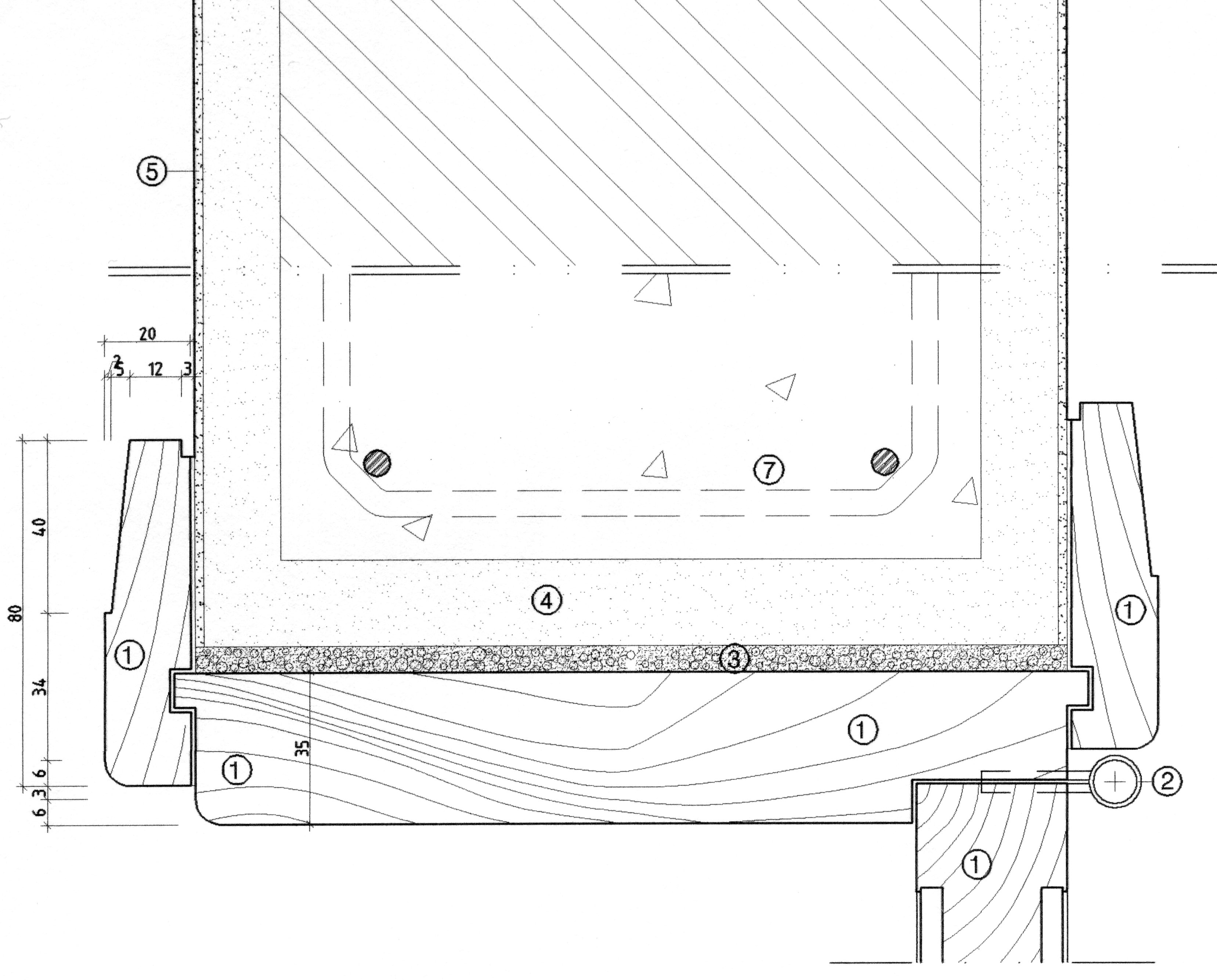 São desenhadas as escadas em pormenor, indicando as dimensões e materiais dos cobertores e espelhos dos degraus, assim como a forma e material da guarda/corrimão.